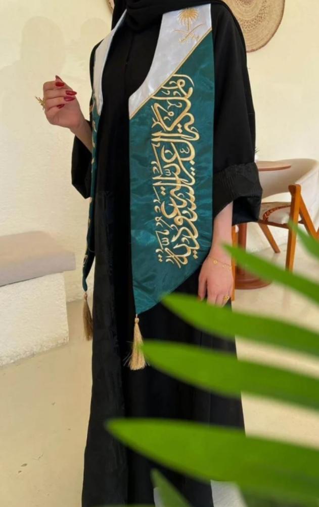 من أجمل الأزياء التي تُرتدى للاحتفال بيوم التأسيس السعودي، نقدم لك وشاحًا فاخرًا يجمع بين *الهوية الوطنية والتصميم العصري* ، مطرز بعناية ليحمل عبارات مثل *"عاش الملك والعلم والوطن"* ، ويعكس روح الانتماء بكل فخر.